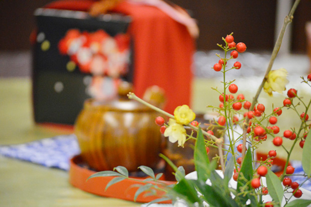 羊羹は冬の寒さに耐え忍び、実る南天をイメージして抹茶パウダーとフローズンストロベリーをトッピング、筝曲、「春の海」が流れてきそうな雰囲気の中、和やかな一時を過ごしました。