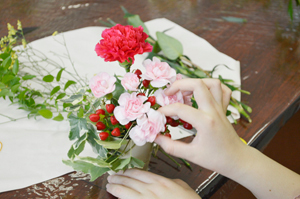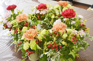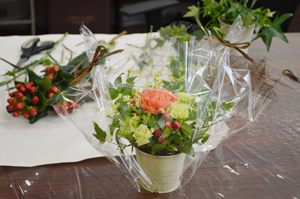 カーネーションや、色とりどりのお花、グリーンに囲まれて、ラッピング迄で完成。