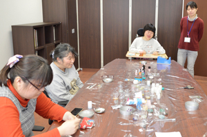 レクチャー役のスタッフは趣味の範囲でしたので、利用者さん達に満足頂けるかドキドキ、途中からリズムに乗って来られた?マニキュアで下地の色を丁寧に塗り重ねられたり、好みのビーズを熟考して絵を描くように思い思いに自分のイメージを追求されたレジンクラフト、天然石やチャーム選び、配置も楽し気に、利用者さん達の目がそれぞれ世界に一つだけの自分の作品!と嬉しそうに誇らしげにキラキラ輝いているようでした♡